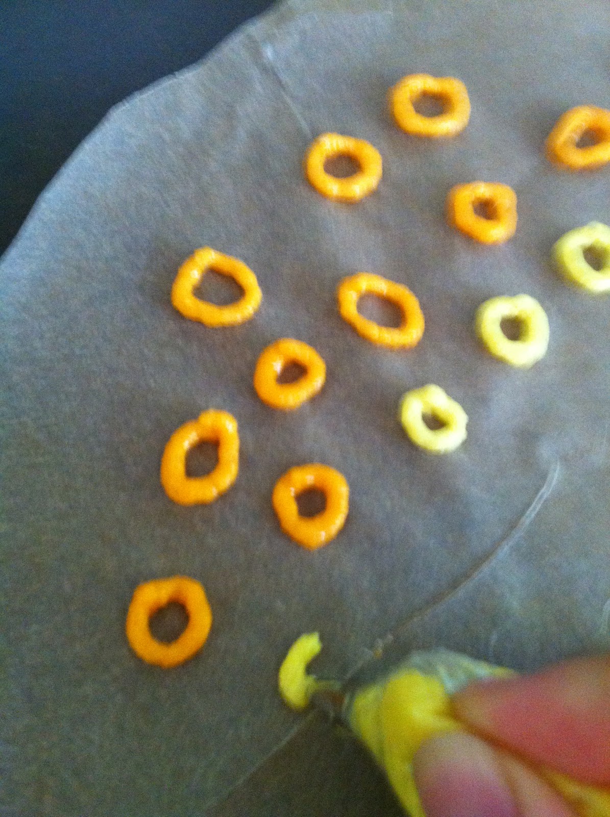 mix the dry ingredients together. mix in the wet ingredients. divide the batter into 3-4 portions depending on the number of colors you have prepared. mix in the jello/crystal light. pour the batter into pastry bag with a small tip (about 1/4in). on baking sheet lined with parchment paper, squeeze out the batter into small circles.