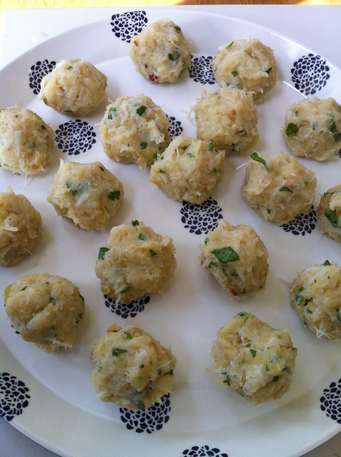 Finely shred cooked cod using food processor. Add to cauliflower. Add cilantro. Mix and season with salt to taste. Add egg yolk and crab. In a small bowl, whisk the egg white to soft peaks and gently fold it into the cod mixture.