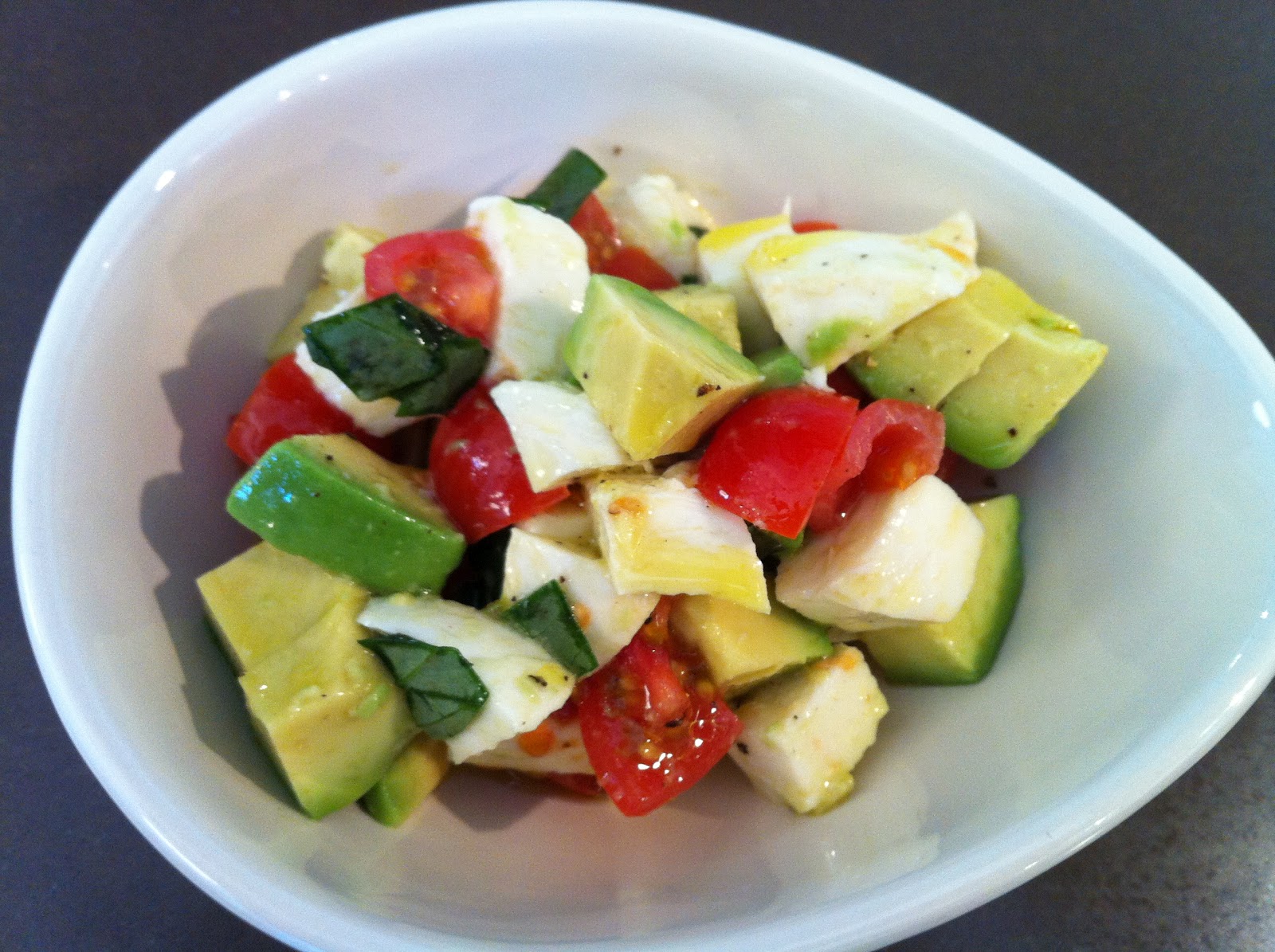 dice mozzarella cheese, tomatoes, and avocado to about 1/2in x 1/2in squares. rip the basil leaves to small pieces. mix all the ingredients in a bowl. season with salt and pepper.