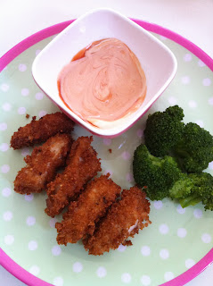 cut the chicken to small pieces. lightly season with salt and pepper. dip each chicken piece into mayo , then roll them in bread crumbs.