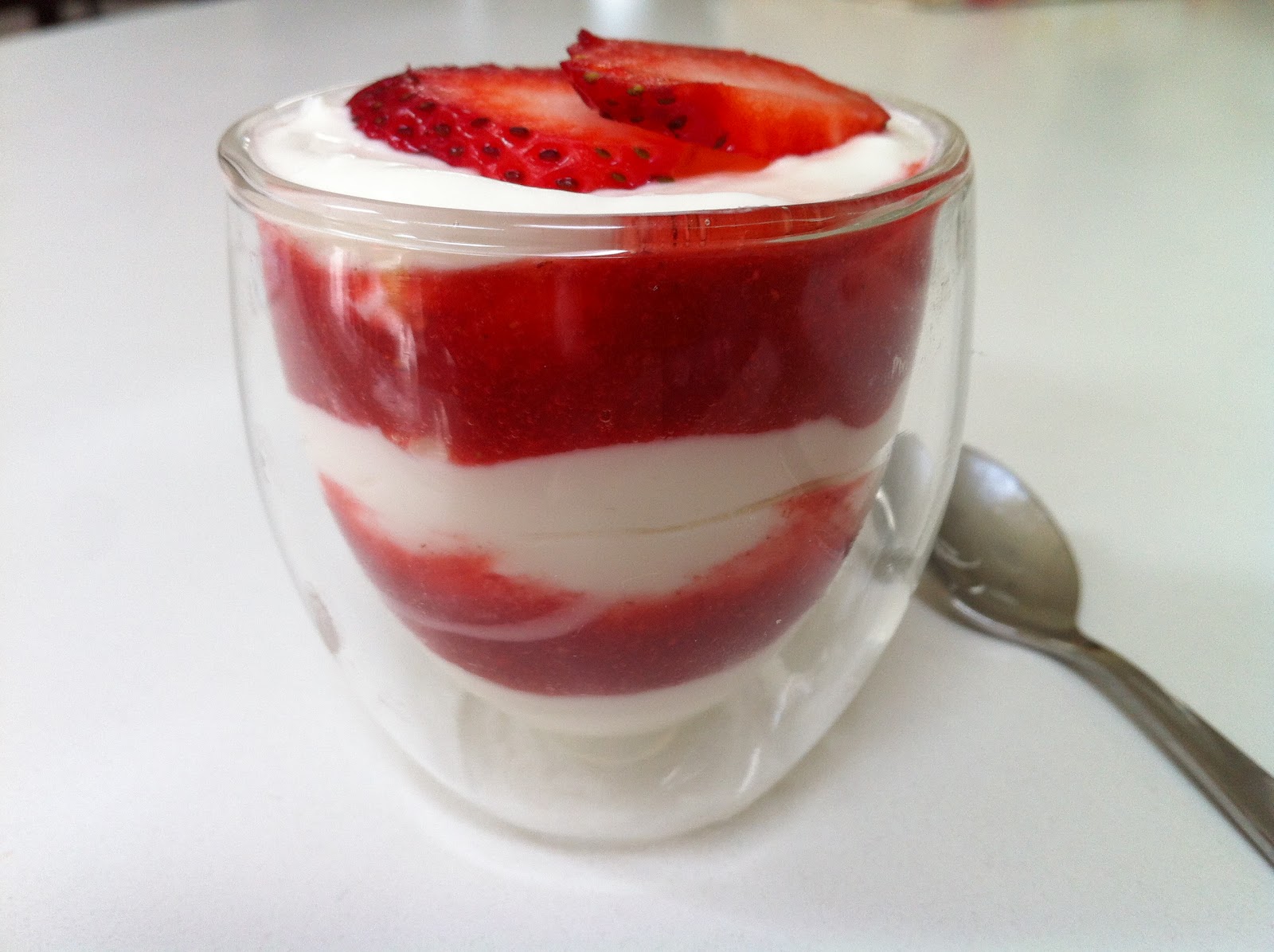 In a glass cup, Spoon in 1/3 of the yogurt, then spoon in strawberry puree, and repeat layering.
