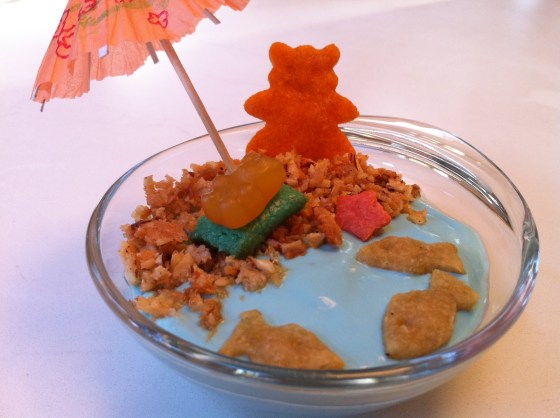 clara’s preschool summer session started this week and of course, as usual, they make their snacks everyday again. today was a beach scene vanilla pudding. i have seen similar recipe in a magazine somewhere (probably in doctor’s office waiting room), but was able to find some images on line like this one. At first, i tried making it with vanilla pudding, but i think it will be much easier with yogurt, so i am including the yogurt version…