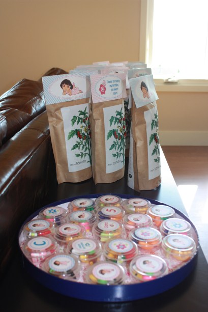 For the party favor, we wanted to avoid any food items to give as gifts.  Clara loves eating mini tomatoes, so i got garden in a bag – mini tomato (found great discount on land’s end online store, very random) and cute little erasers in fun shapes from Daiso.