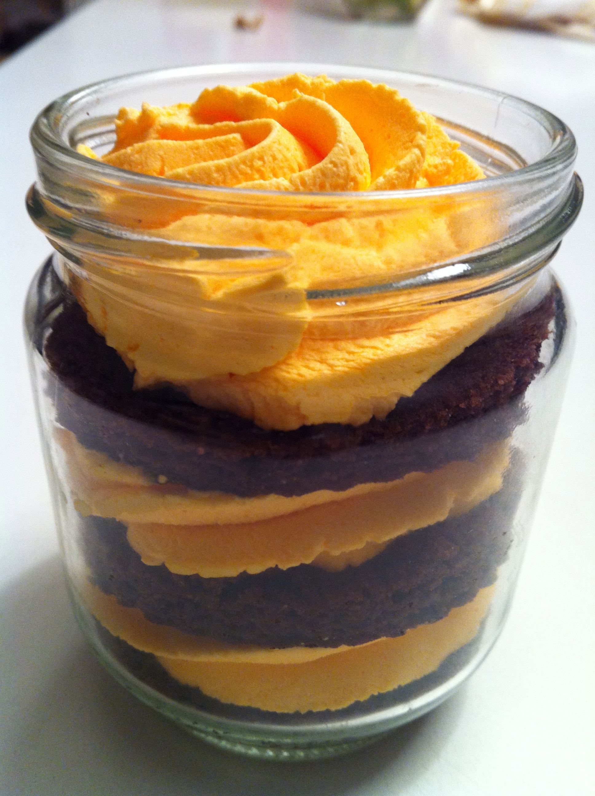 you can make these any way you like, but here is how i made this.  i baked the chocolate cake in a cake pan that was large enough to spread the cake batter out into thin layer (3/8in thick) and baked for 10 minutes.  used a circle cookie cutter that was the size of the jar (if you are using a cup, just use the top of the cup to cut out the correct size) and cut out three circles.  place one cake at the bottom of the jar, then pipe out, or spoon in 1/3 of the cream.  repeat three times.  if you close the lid and store in the refrigerator, it stays fresh for a few days.  i would imagine it will freeze really well too, but haven’t tried it.