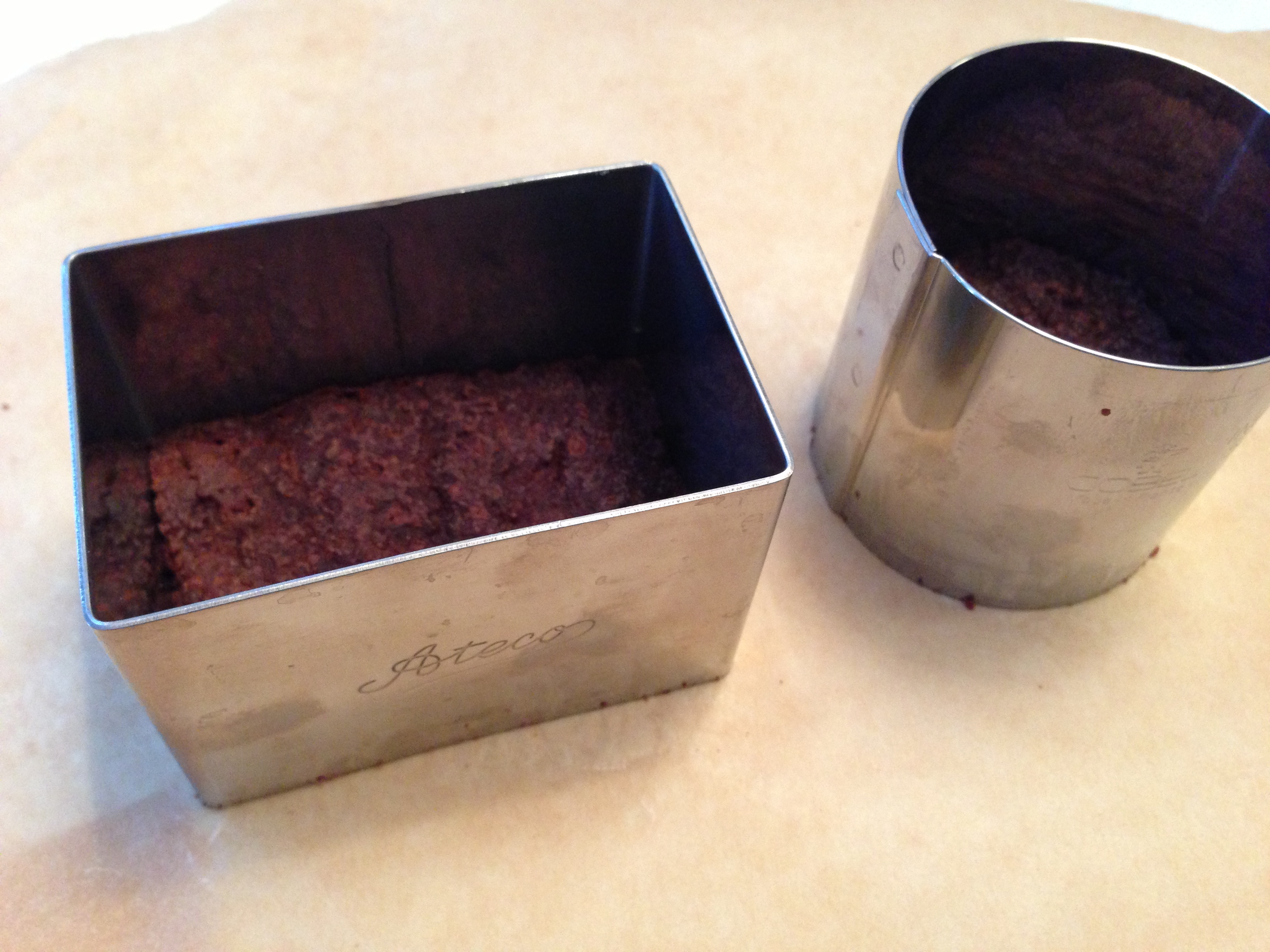 Cut the cake with each ring mold.  Keep the cake in the mold and place the mold on a parchment lined pan that will fit in your freezer.