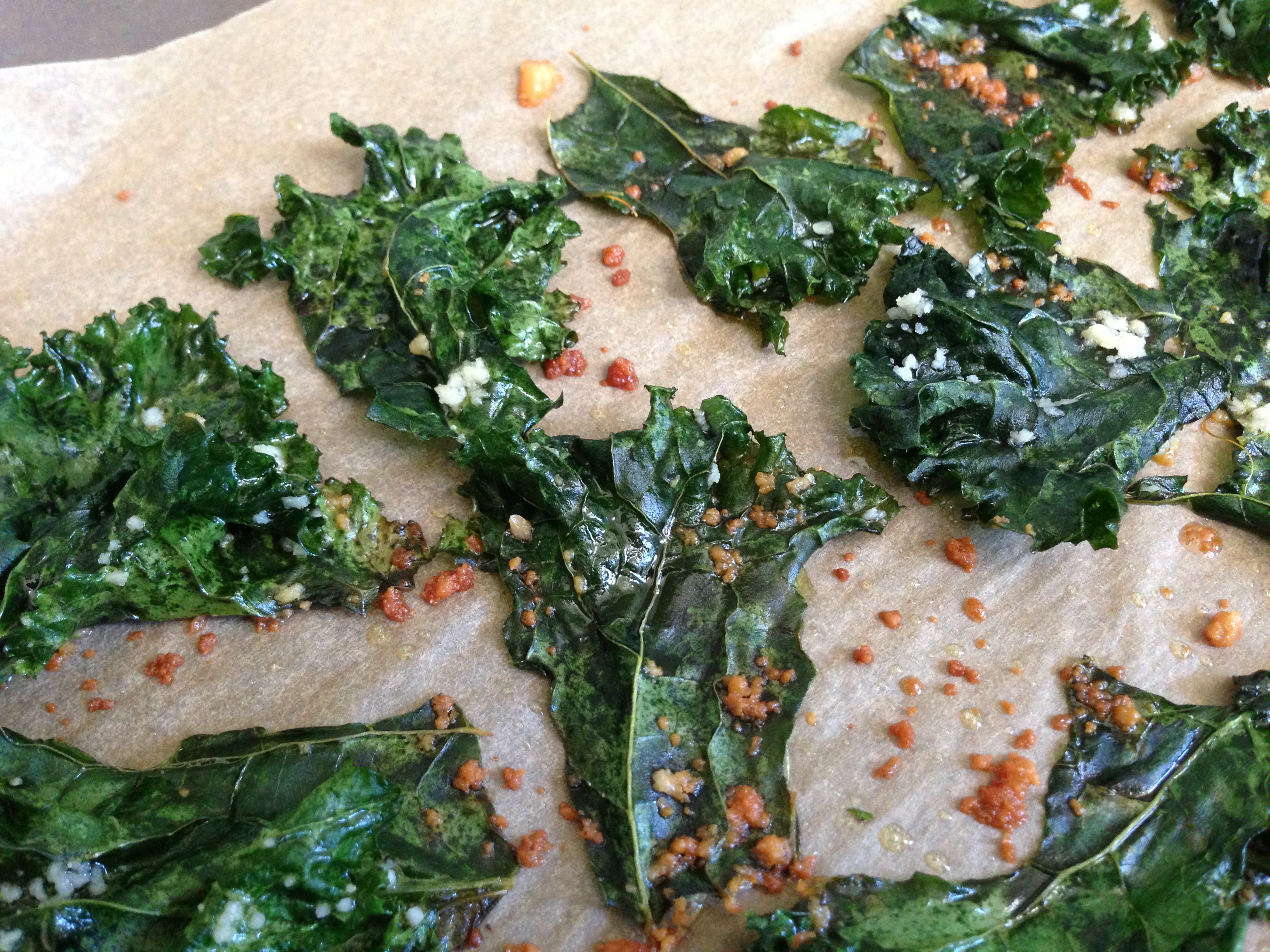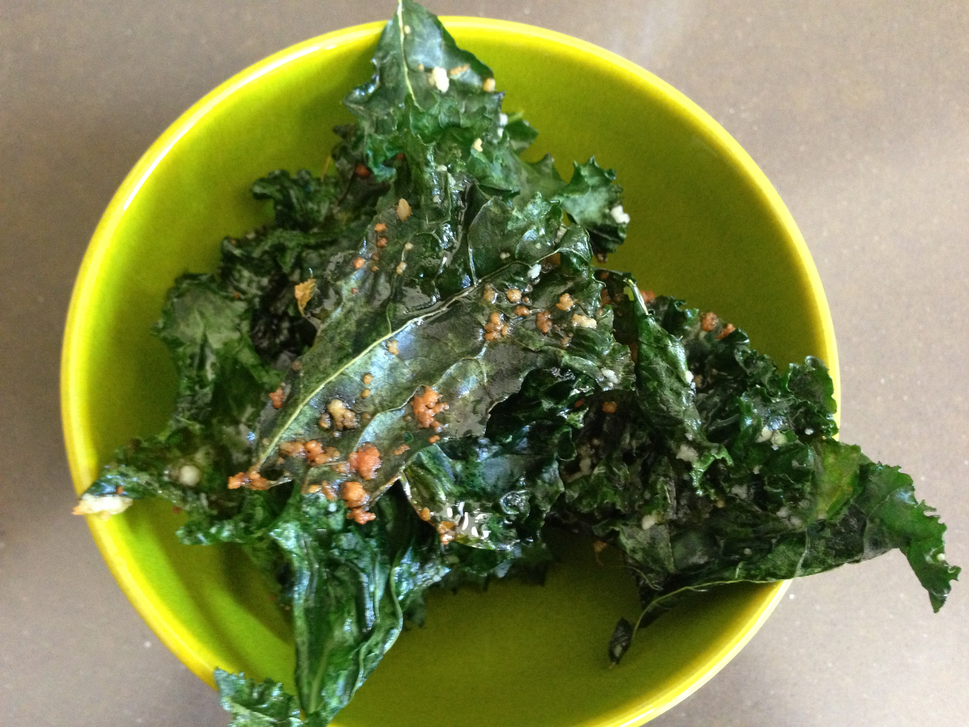 Wash the kale leaves very clean and blot it dry with paper towel. Tear the leaves into small pieces, about 2in x 2in size. Place the leaves on a baking pan lined with parchment paper. drizzle with olive oil and salt & pepper. Mix well to coat the leaves. Spread out the kale leaves to make sure they are not overlapping. Sprinkle the parmesan cheese. Bake at 275 for 15-18 minutes.